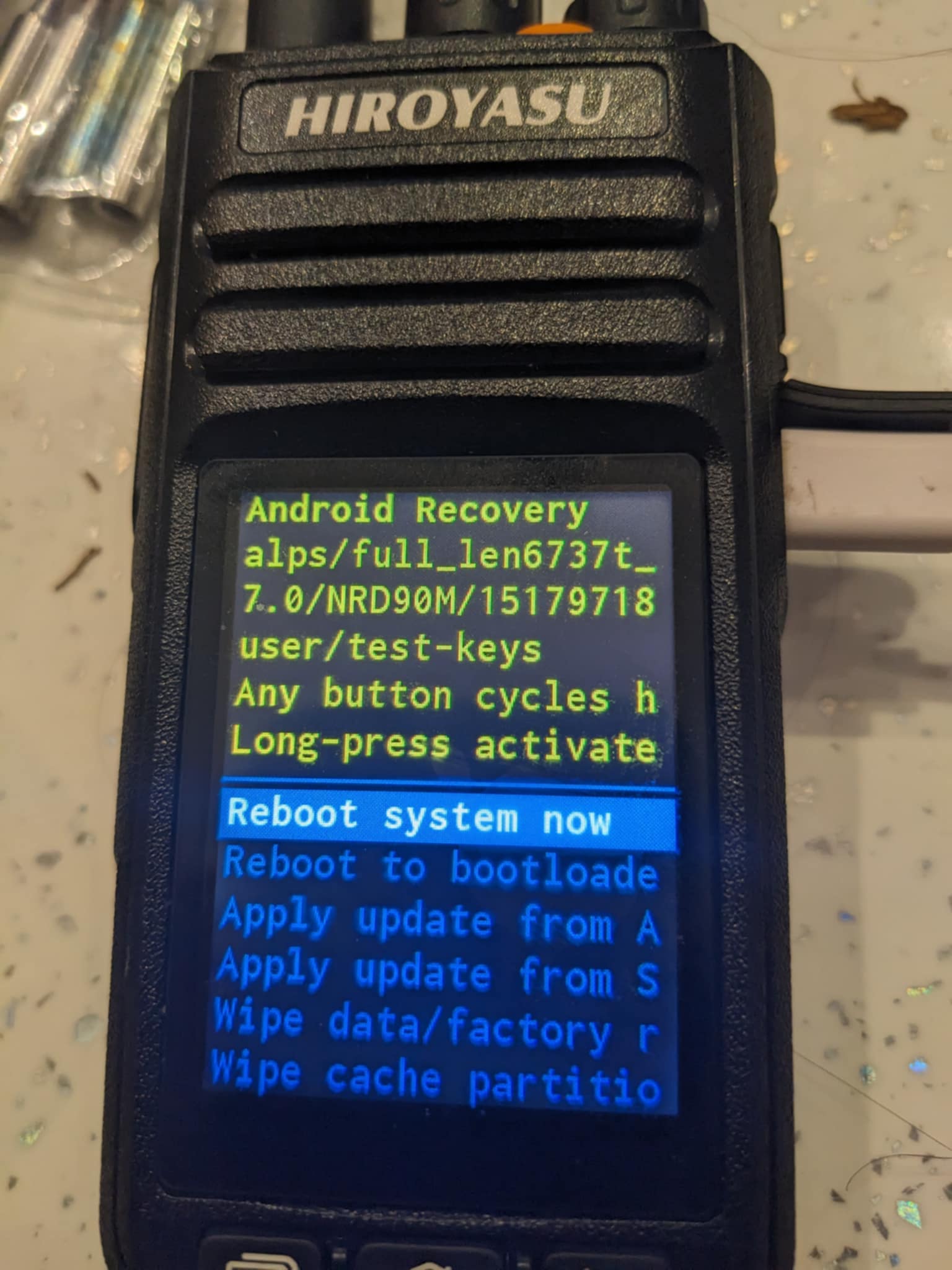 Then wait for the radio to reboot. you can now use the knob next to the antenna to the navigate up and down through the menu’s to select an item just hold down the orange emergency button on the top of the radio for a couple of seconds. Please note while in this mode the radio is also still available via adb.